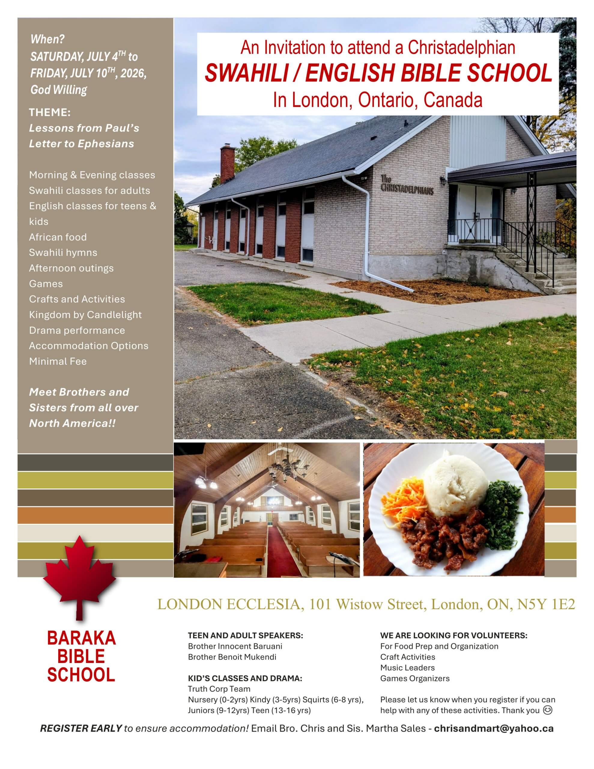 Kwa ridhaa ya Mungu, tunapanga kuendesha Shule Maalumu ya Biblia mwaka 2026 huko London, Ontario. Shule hii itakuwa ya Kiswahili na Kiingereza, kwa lengo la kuwaleta pamoja ndugu na dada wenye urithi wa Kiafrika kutoka kote Amerika