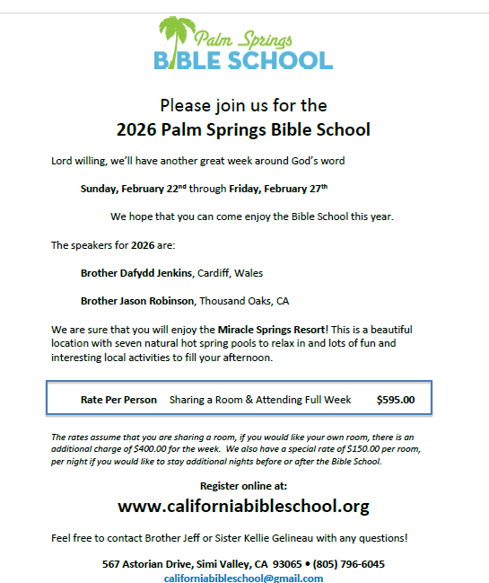 We are looking forward to another Palm Springs Bible School February 22 through 27, 2026. Our speakers are Bro. Dafydd Jenkins from Cardiff, Wales and Bro. Jason Robinson from Thousand Oaks, CA. Details in the image below.
