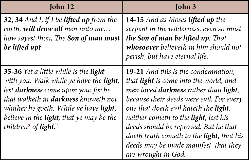 There is good reason to think Nicodemus was there, listening to that last discourse (John 12:30-50), because the words of the Lord take us back to the first conversation he had with Nicodemus, recorded in John 3 (see table).