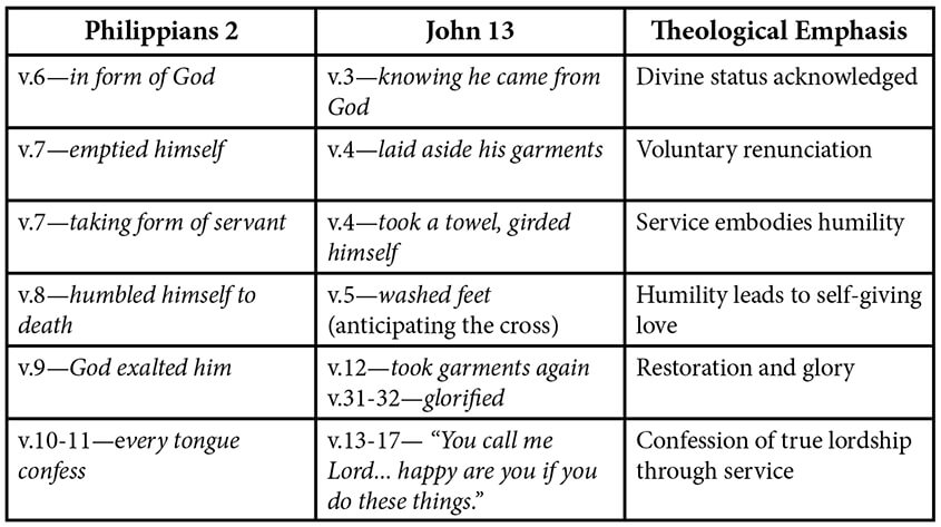 In both passages, the context is not primarily doctrinal, but ethical, where the act (washing feet/self-emptying) becomes the pattern for love between disciples. Paul’s description of Christ’s humility is not an isolated theological text but an illustration of what he writes in the first few verses. The same is true in John 13, where Jesus’ act of washing feet serves as a demonstration of the new commandment to love (John 13:34-35).