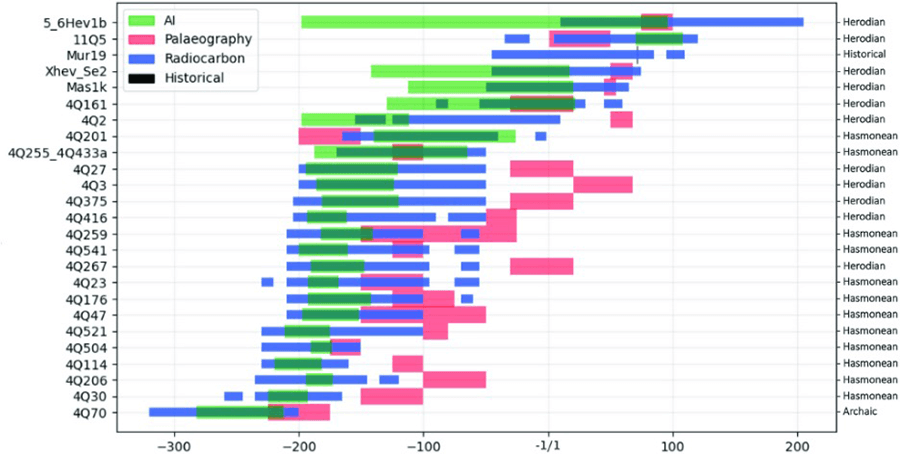 Popović and his coresearchers published the findings of their study in an academic paper entitled “Dating Ancient Manuscripts Using Radiocarbon and AI-based Writing Style Analysis” in June 2025. Instead of relying on human paleographic analysis, they decided to use Enoch, an artificial intelligence model they trained to analyze ancient handwriting. Thus, their study approached dating the scrolls in two ways: carbon dating (accounting for castor oil) and paleography by AI. Their results are shown in the chart that follows.