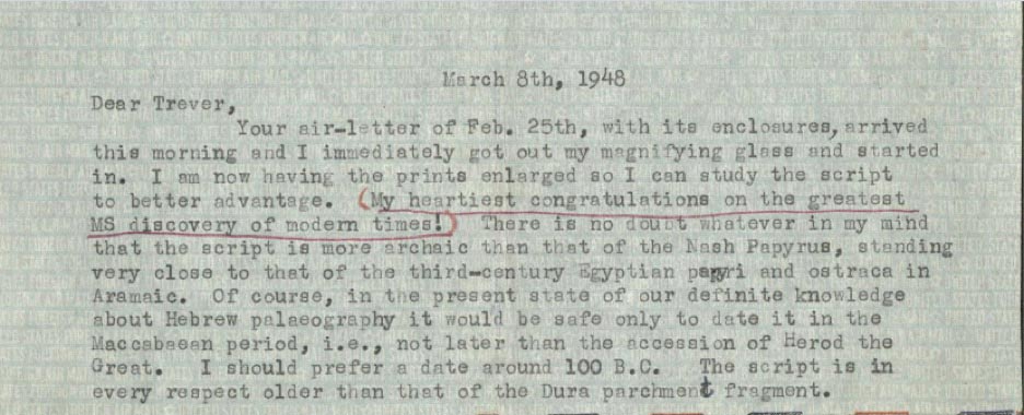 It was early 1948. Mar Samuel, the head of a monastery in the Old City of Jerusalem, presented the first four newly discovered Dead Sea Scrolls to John Trever, an American researcher in Jerusalem, and Trever felt a sense of awe. He took pictures of what he believed would profoundly change Biblical scholarship and then sent them to William Albright, his superior, who was on sabbatical at Johns Hopkins University. Albright wrote back:
